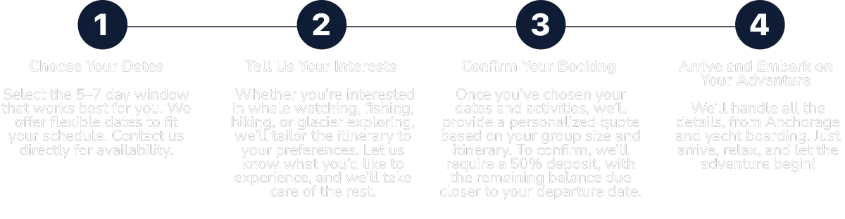 We’ll handle all the details, from Anchorage and yacht boarding. Just arrive, relax, and let the adventure begin!